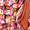 個性的な柄です。オレンジ系のベースにピンク系のプリントが綺麗な色の組合せです。色違いに赤ベースもあります。シホン系の軽長袖が透け感をより引き立たせます。手首にファスナー付きで手を挙げても、肌が露出いたしません。写真より広げるとスカートのボリュウムがあります。ヒップまではマーメイドライン。 |