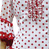 可愛いツーピース。とにかく軽いスカートです。オーバーブラウスは反対色の水玉とボンボンフレードと裾のフリルを施しスカートは縦のフリルを意識して寂しくならないデザインです。色違いの組合せはご来店の際に、生地サンプル帳から選べます。