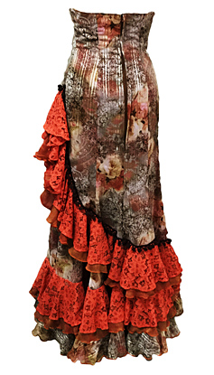ハイウエストスカート 斜めフリル。 ストライプの地模様に更にプリントを施し、レースや個性的な素材をふんだんに使用した1点物の オレンジベースのスカートです。 フリル付け根にはボンボンブレードこげ茶色の装飾でアクセント。また定番人気の前中心にはリボンを付けました。調節が出来るので便利です。 写真より実際の方がベージュ系で明るいです。