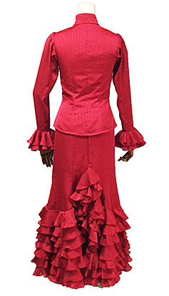 ツーピース。人気デザインのハイネックを前開きにしました。上部にはチャイナボタンが一つ ついています。細めのストライプが透けている所とサテンで光るところが交互になります。袖は透け感を引き立てるために一重仕立てです。シンプルで シージョ等を組み合わせれば色により 様々なアレンジが可能一色製作にこだわりました。スカートは細めバックフリルを豪華に7段。マーメイドラインで製作いたしました。
